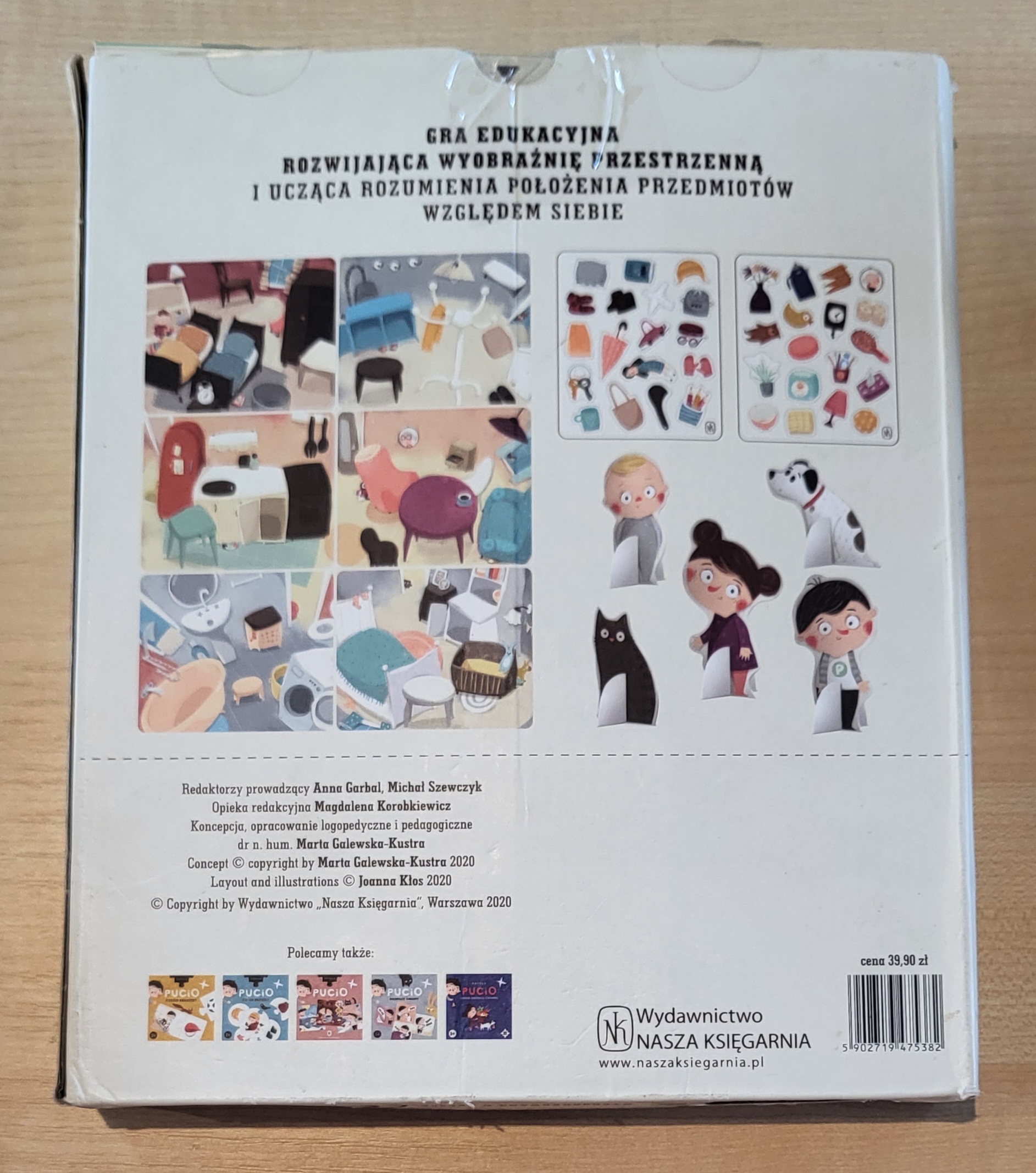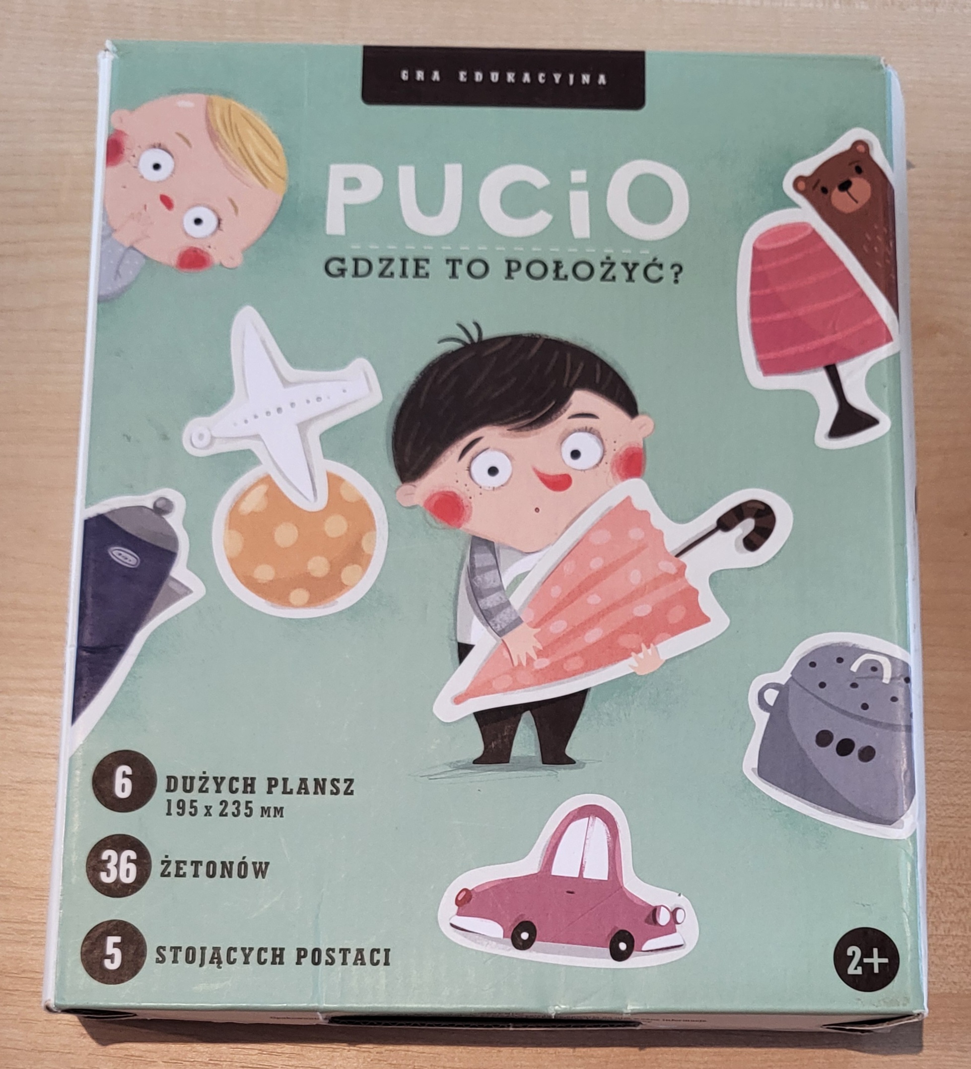 Gra edukacyjna z serii Pucio, rozwijająca wyobraźnię przestrzenną i ucząca rozumienia położenia przedmiotów względem siebie. Wspiera rozwój mowy i myślenia. Zawiera 6 plansz, 36 żetonów i 5 stojących postaci.