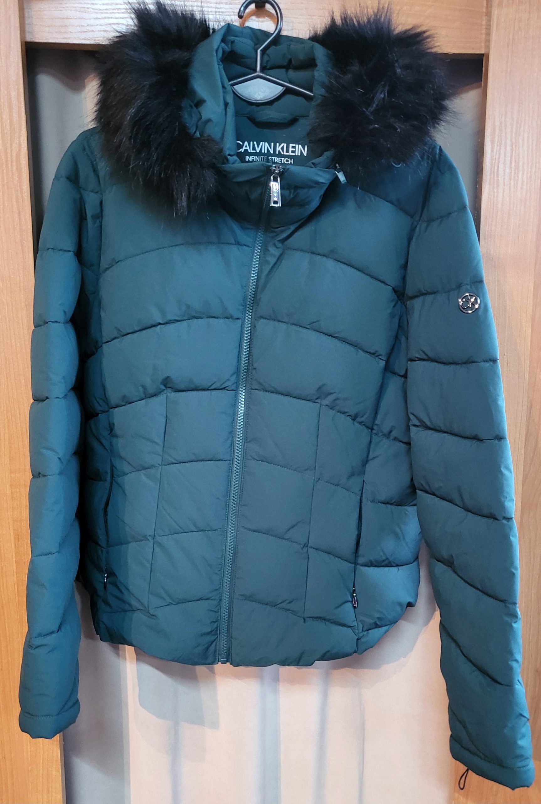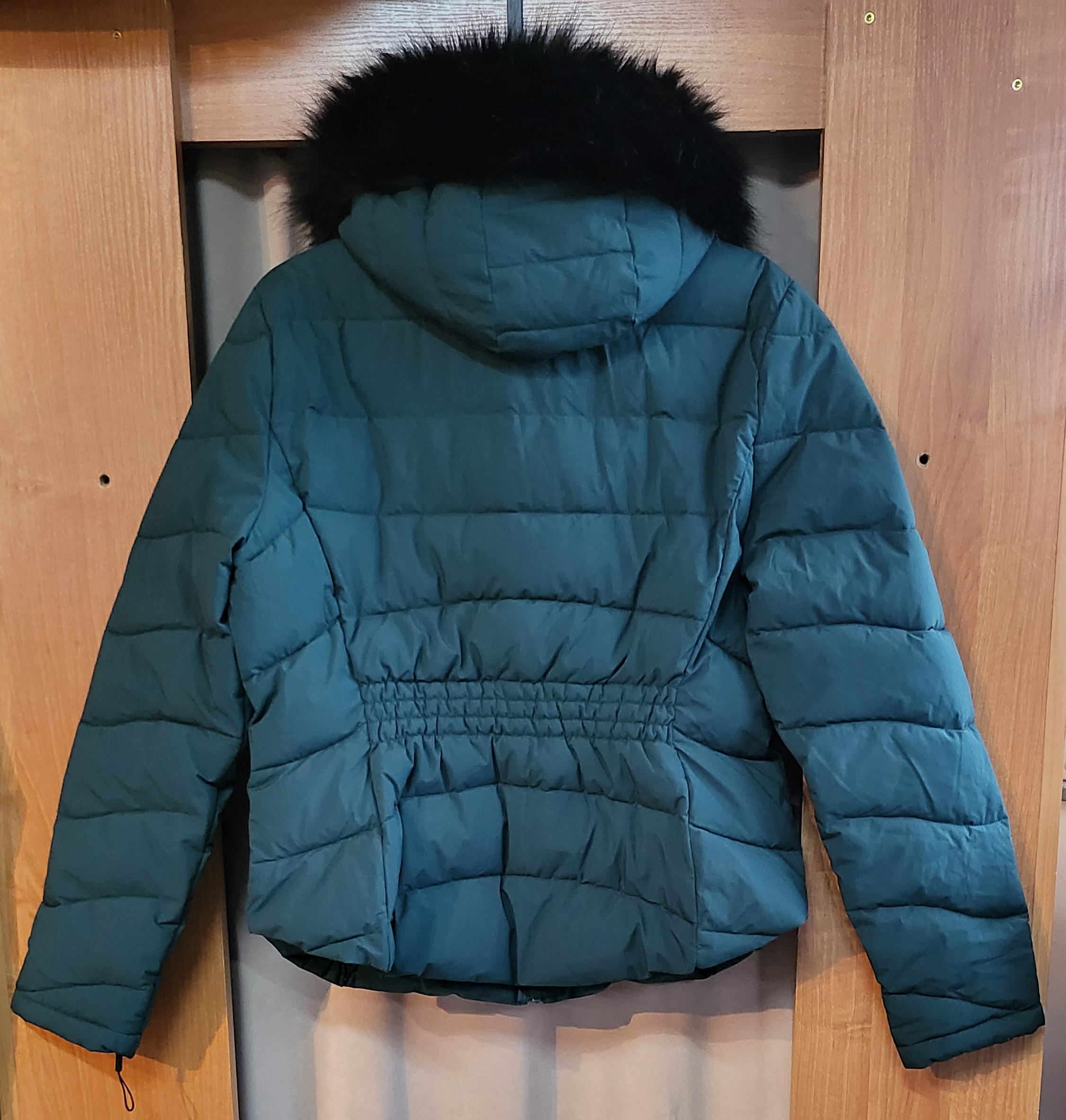 Kurtka zimowa z kapturem obszytym futerkiem, wodoodporna, współczynnik ciepła do – 9,5 C, zasuwana na zamek, butelkowa zieleń, bardzo lekka.